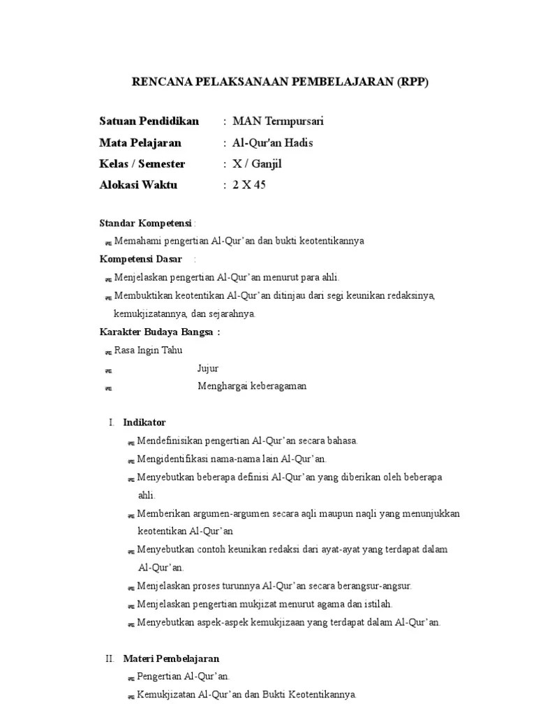 Rpp Semster Ganji Al Quran Hadis Kelas X Contoh Rpp Quran Hadits |